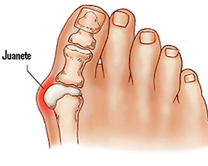 Conocido como Hallux Valgus, es una desviación que ocurre entre el dedo gordo y el primer metatarsiano del pie. Produce una prominencia dura en el borde del pie que se inflama con el roce del calzado apretado, dando lugar a los síntomas característicos de dolor, incomodidad, ardor y dificultad para caminar.